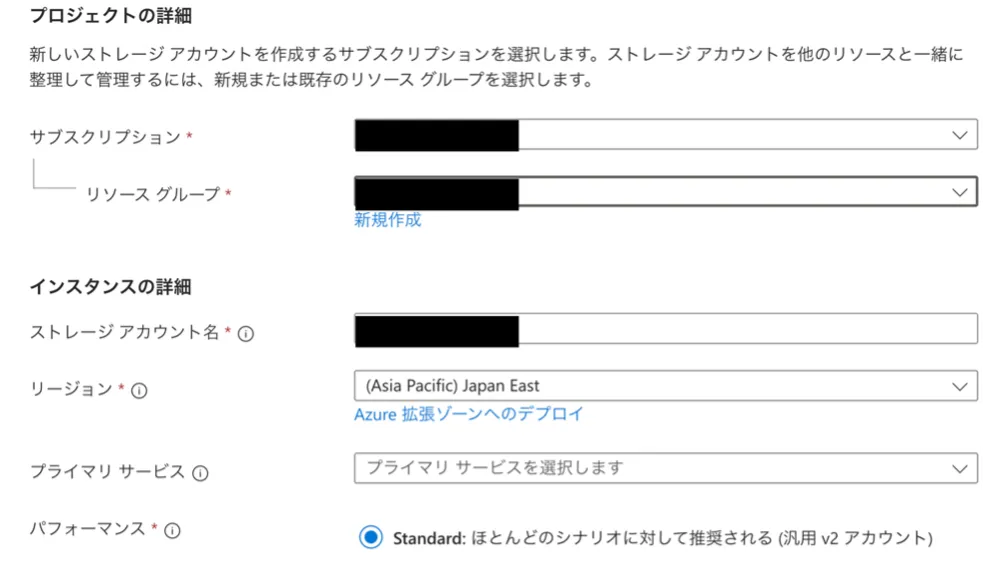 - 適切なサブスクリプション,リソースグループを選択し,ストレージアカウント名を入力します.ストレージアカウント名は,規則のもとで自由に設定できます.
