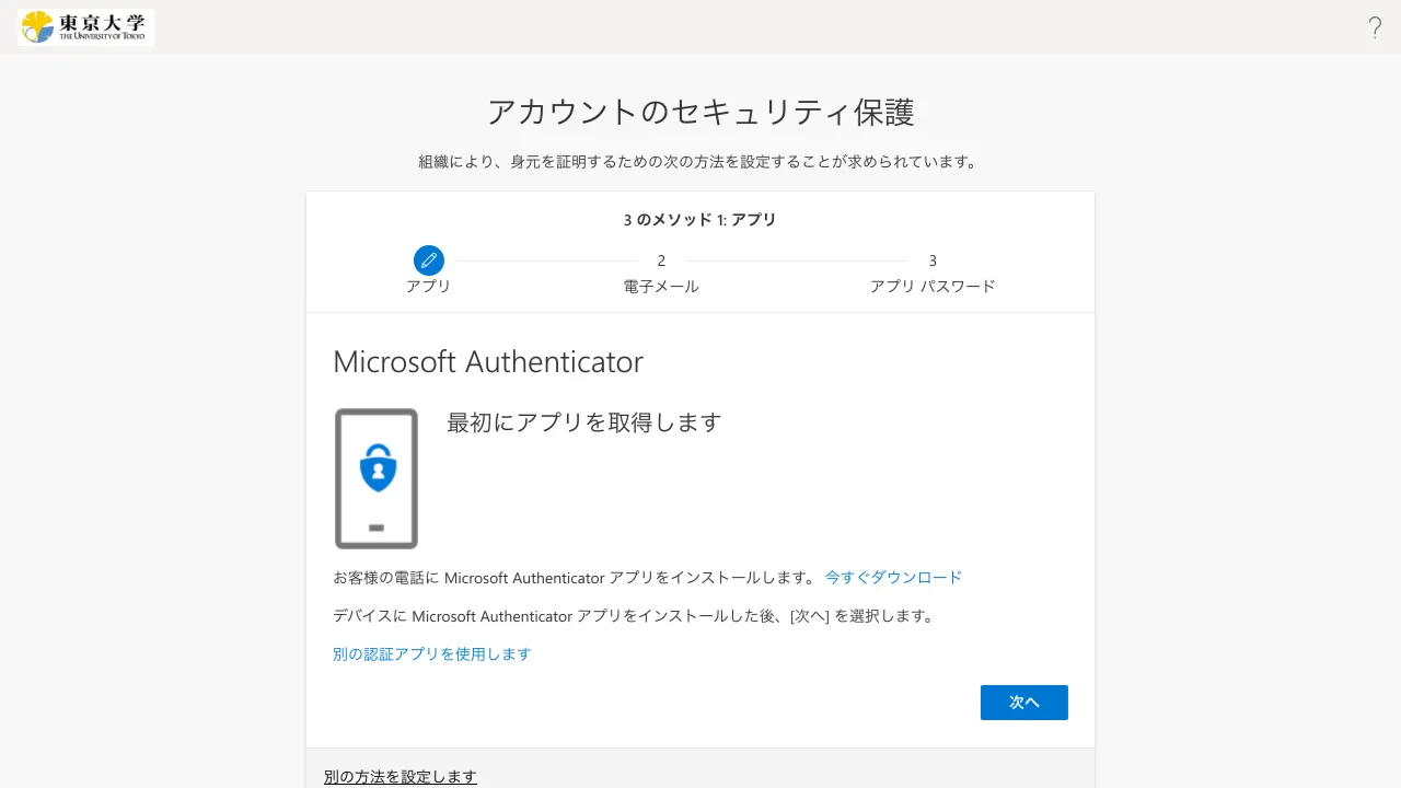 多要素認証の本人確認方法を設定する画面になります.デフォルトでMicrosoft Authenticatorの設定をする画面になっているので,そのまま「次へ」を押してください.