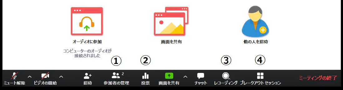 - このコンピューターにレコーディング : ホストが許可をしている場合レコーディングができます.このボタンは開催関係者以外は利用しないことが多いです.