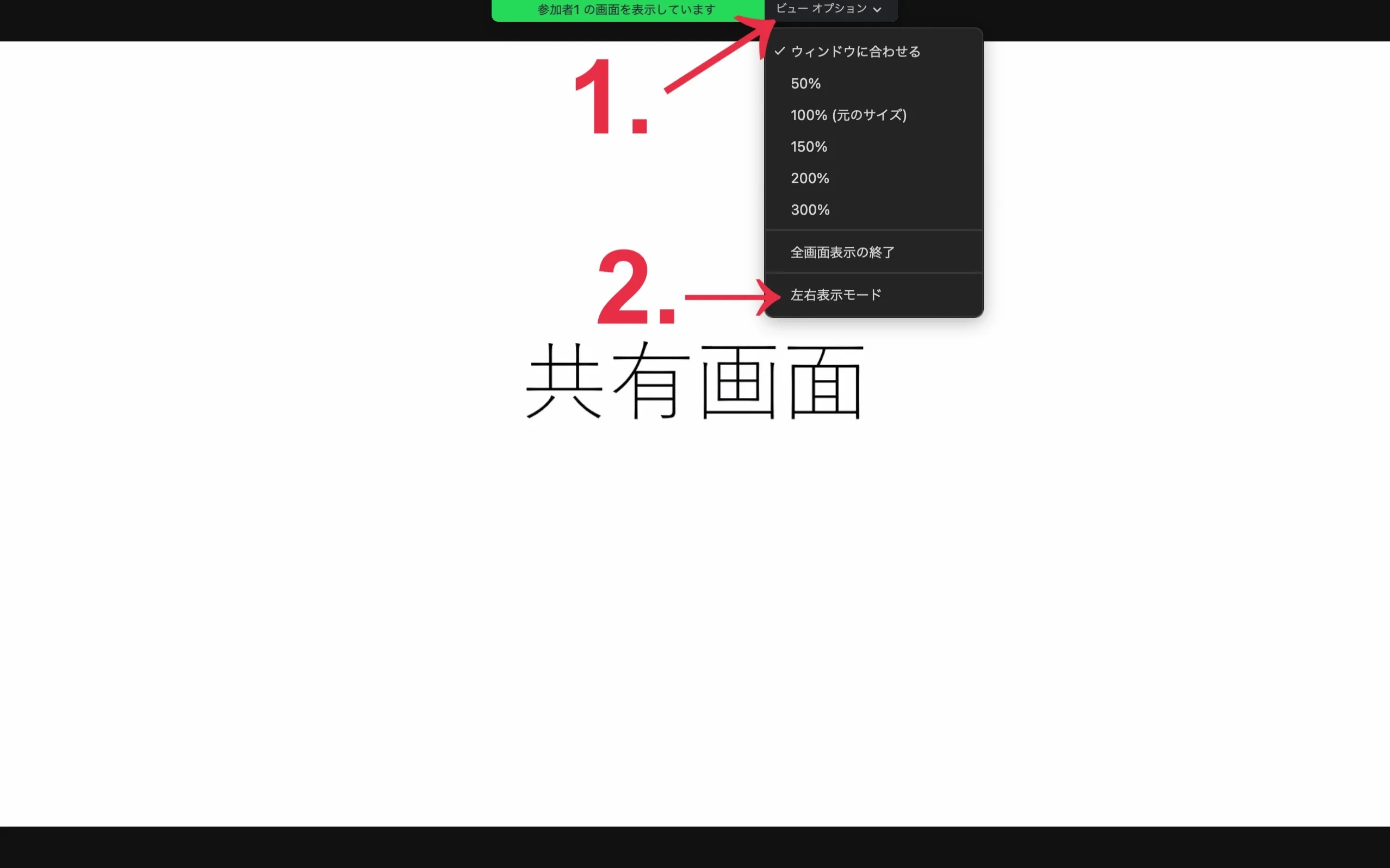 画面共有が行われている場合には,デフォルトでは共有画面が全画面表示されます.また,全画面表示を解除すると,共有画面が大きく表示され,参加者のビデオは上に小さく表示されます.しかし,場合によっては共有画面よりも参加者のビデオを大きく表示したい場合があります.その場合,左右表示という機能を使用すると便利です.